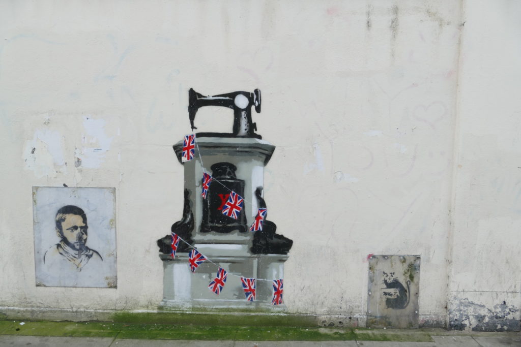 The location of the piece is significant, implicating Poundland in its criticism: the shop was selling decorations like those depicted and had previously been linked to the use of child sweatshop labour. Banksy therefore uses the piece to draw ‘attention to the conditions of production of these disposable nationalist icons‘ (Hansen and Flynn, 2015, p. 901), prompting the viewer to reflect on their consumerist habits (Source: Hines 2021, np link).